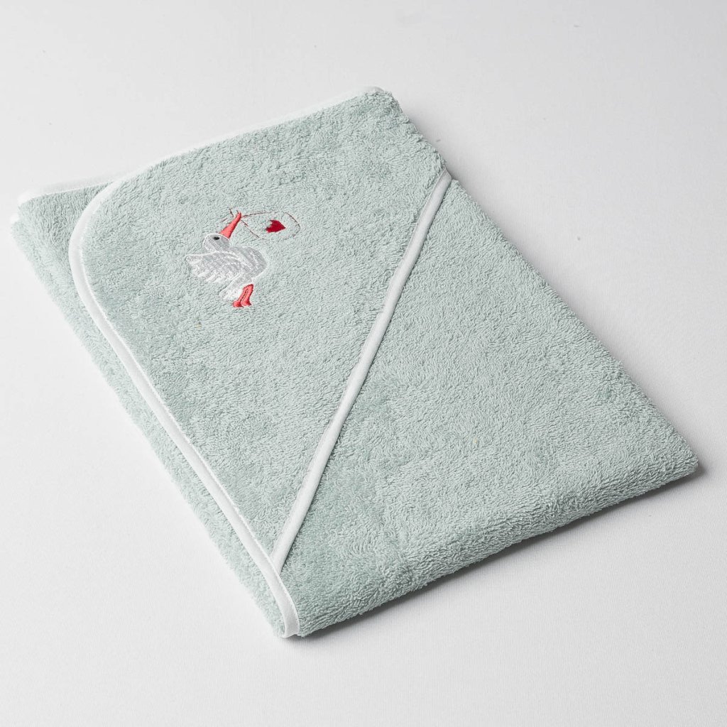 Dětská osuška Veba LOTA s kapucí zelenošedá s výšivkou Čapí pošta bílá lemovka