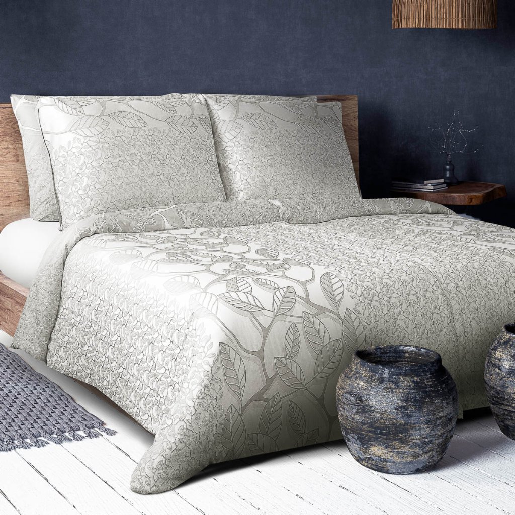 Jemné, propracované linie vytvářejí moderní a sofistikovaný motiv, který se skvěle hodí do každé ložnice. Vzor se skládá z drobných, detailních lístečků, jež tvoří bohatou texturu a dodávají povlečení hloubku a plastičnost. Mezi nimi se pnou stylizované, výraznější větve, které designu propůjčují vzdušnost a lehkost. Každý detail je promyšlen tak, aby povlečení působilo elegantně a nadčasově.