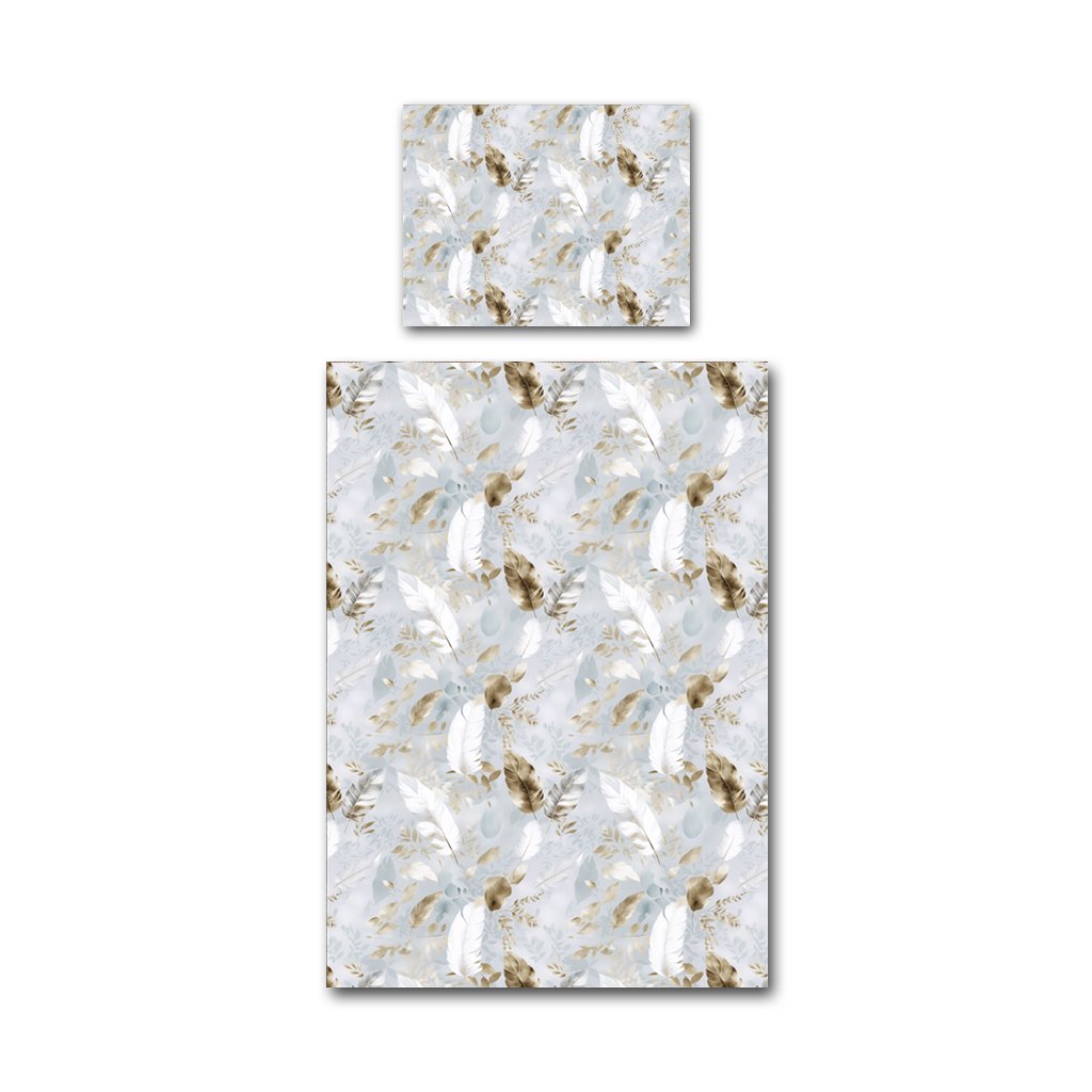 Motiv kolekce Boho tvoří jemně vykreslené lístky, klasy, peříčka a větvičky, které se prolínají ve světle modrých, béžových, krémových a karamelových tónech. Celkový dojem je přírodní, vzdušný a harmonický – jako procházka letním polem v podvečerním světle. Digitální tisk dodává vzoru precizní detaily a realistickou kresbu.