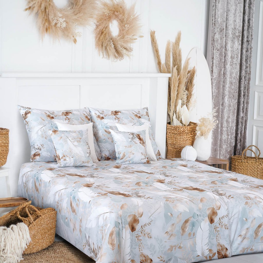 Zahalte svou ložnici do hebké elegance s povlečením Boho, které v sobě snoubí přírodní jemnost s moderní lehkostí. Motiv jemných lístků, travin a peříček v tlumených tónech béžové, krémové a světle modré působí klidně a harmonicky. Nadčasový vzor podtrhuje vzdušnost ložnice a ladí s oblíbeným boho stylem.