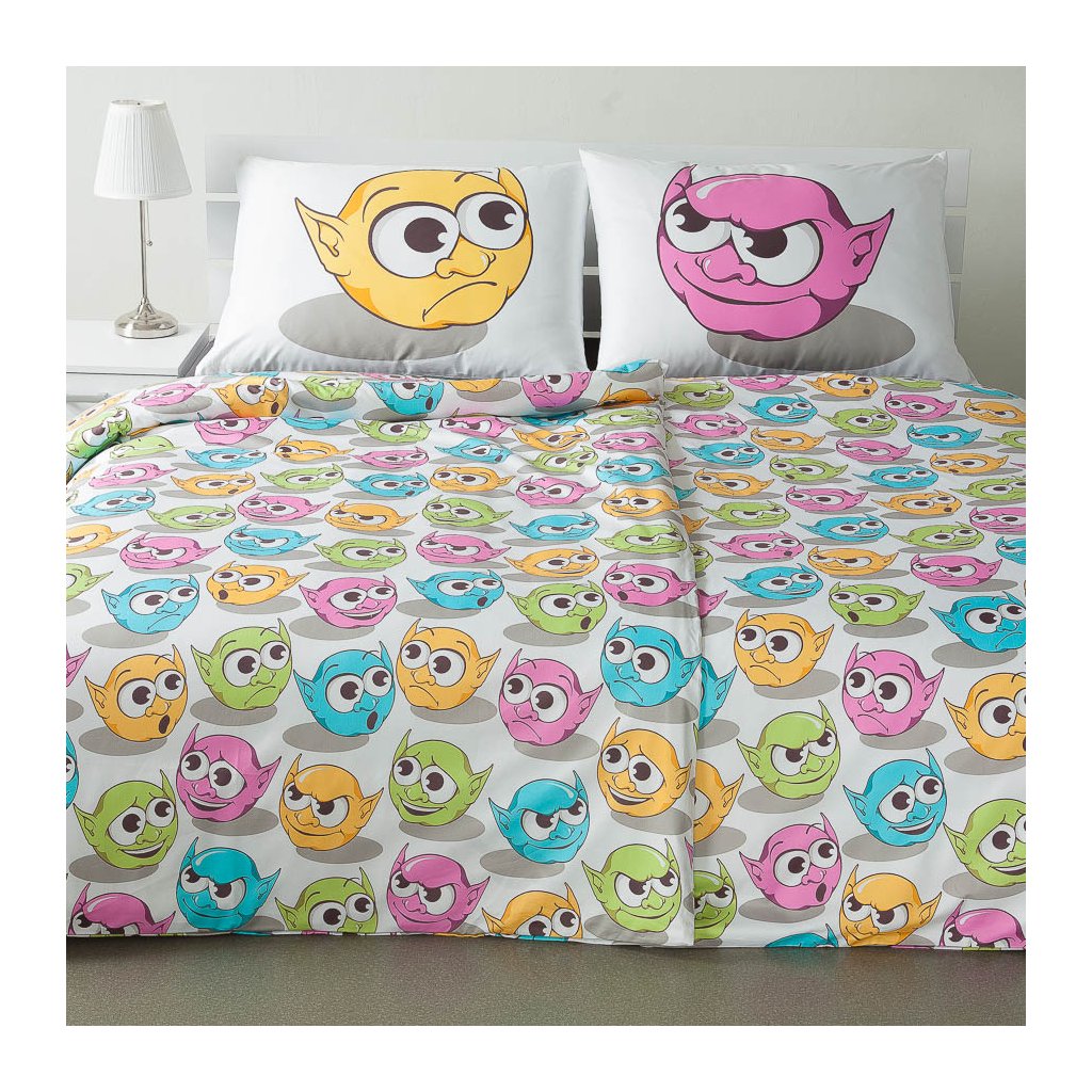Barevné, veselé a rozhodně nepřehlédnutelné – přesně takové je ložní povlečení, které přináší zábavu do každého dětského pokoje. Hlavním motivem jsou roztomilé mimozemské hlavičky s výraznýma očima a ušima, které se tváří překvapeně, rozverně i zamyšleně. Postavičky se objevují v pestrých barvách – růžové, tyrkysové, zelené, žluté a oranžové – a střídají se po celé ploše povlečení.