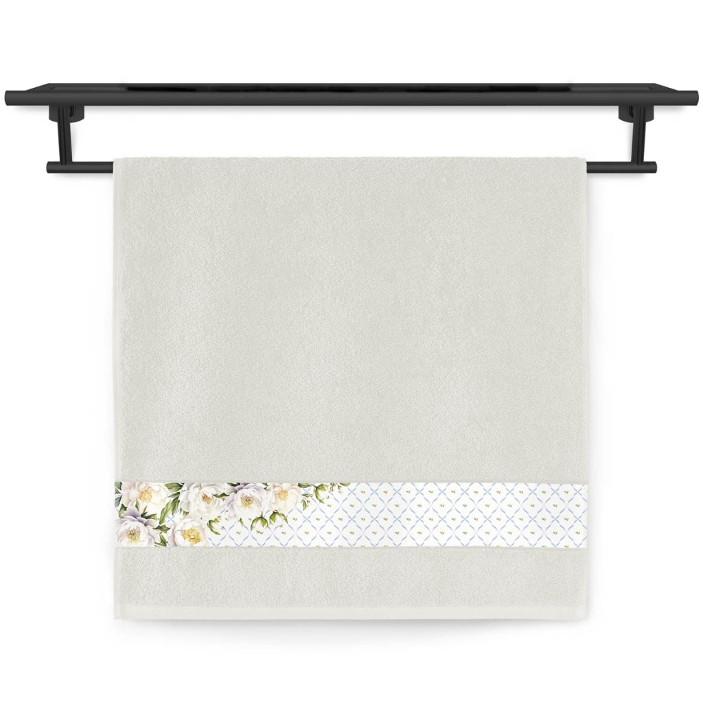 Vneste do každého dne dotek jemnosti a romantiky. Tento ručník s elegantním sublimačním tiskem zdobí okouzlující motiv bílých květů v levém rohu, které působí svěže a slavnostně zároveň. Květinová kompozice je doplněna stylovým geometrickým pozadím v decentních tónech modré a béžové, které vytváří dojem luxusní bordury.