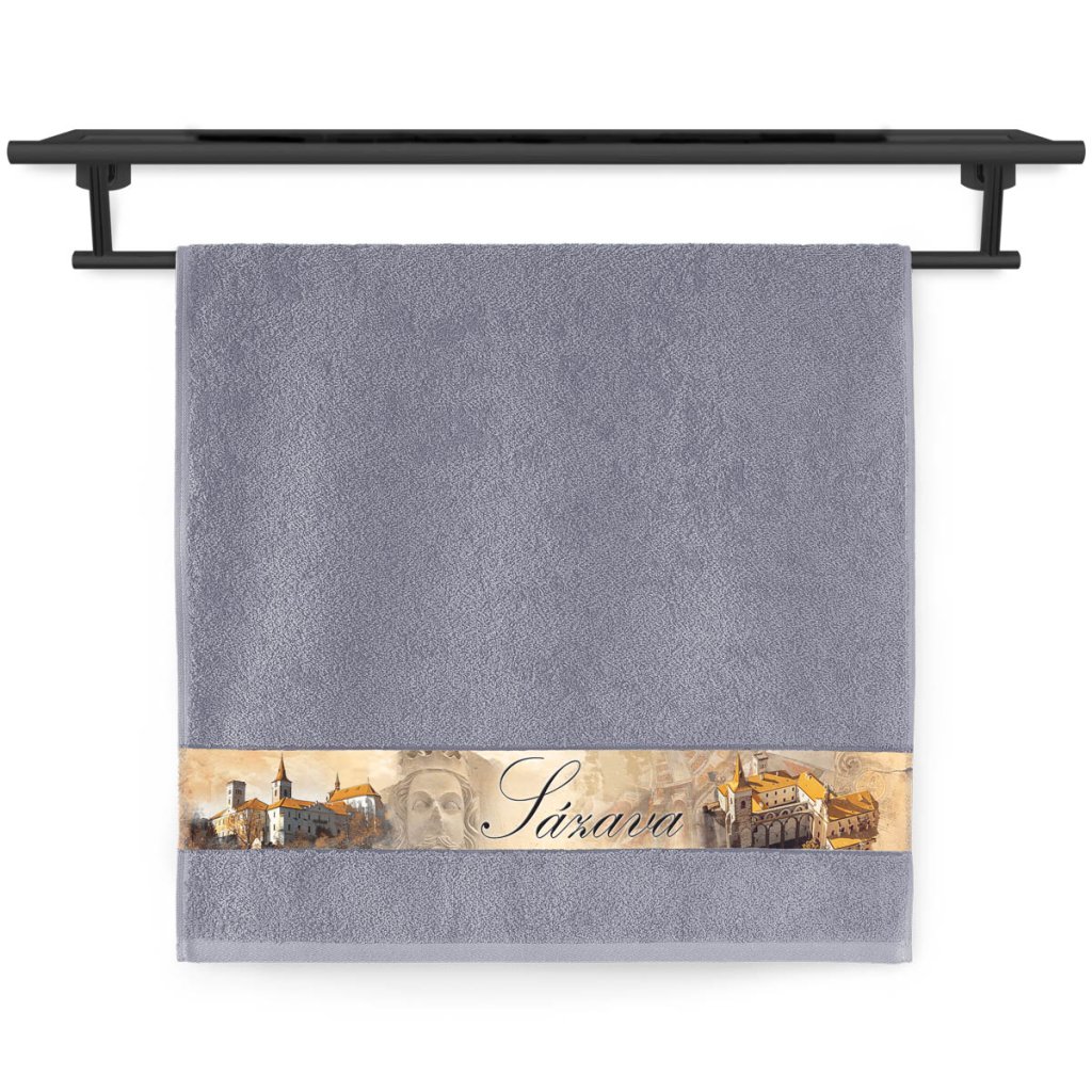 Elegantní nápis „Sázava“ doplňuje celkový dojem a podtrhuje regionální charakter motivu. Ručník je nejen praktickým doplňkem, ale i krásnou vzpomínkou na místo s bohatou historií – ideální jako dárek nebo suvenýr.