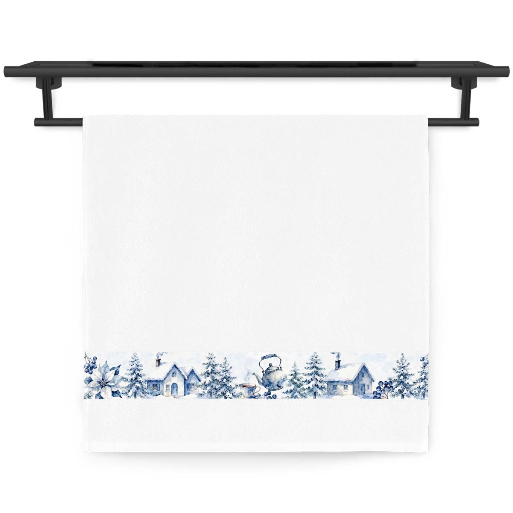 Froté ručníky a osušky Zimní vesnička zdobí elegantní bordura s jemným akvarelovým tiskem. Motiv zachycuje zasněžené chaloupky, tiché smrkové lesíky a drobné zimní prvky v harmonii modrých a bílých tónů. Celek působí klidně, čistě a nadčasově – nepřebíjí vzhled ručníku, ale dodává mu kouzelný zimní akcent.