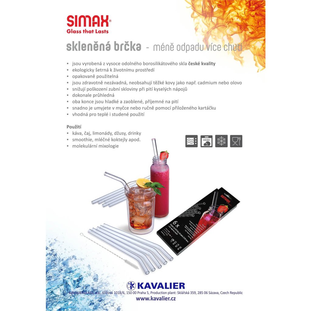 Brčka jsou vyrobena z kvalitního a tepelně odolného borosilikátového skla SIMAX, které zajišťuje dlouhou životnost, bezpečné používání a zdravotní nezávadnost. Údržba je velmi snadná – brčka lze mýt v myčce. Výrobky jsou schváleny pro styk s potravinami v domácnostech i profesionálních provozech a podléhají dozoru státních kontrolních orgánů České republiky. Sklo je vyrobeno bez obsahu kadmia a olova.