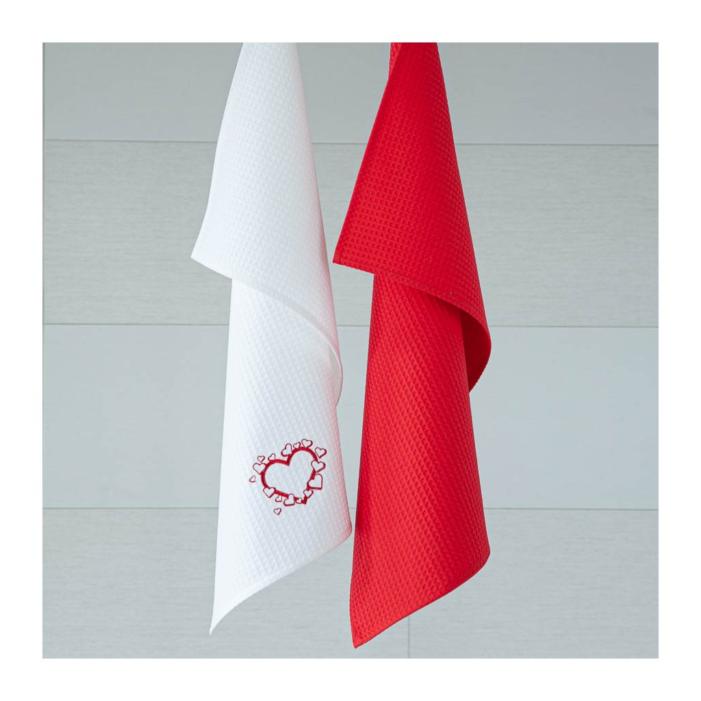 Vaflové utěrky - vysoce savé, rychle schnoucí. Dobře vypadají a jsou velmi praktické - je dobré je mít vždy po ruce! Utěrky dodáváme jako set 2ks, červená utěrka + bílá s výšivkou srdíček. Obě utěrky jsou zakončeny obrubou, mají praktické poutko na zavěšení.