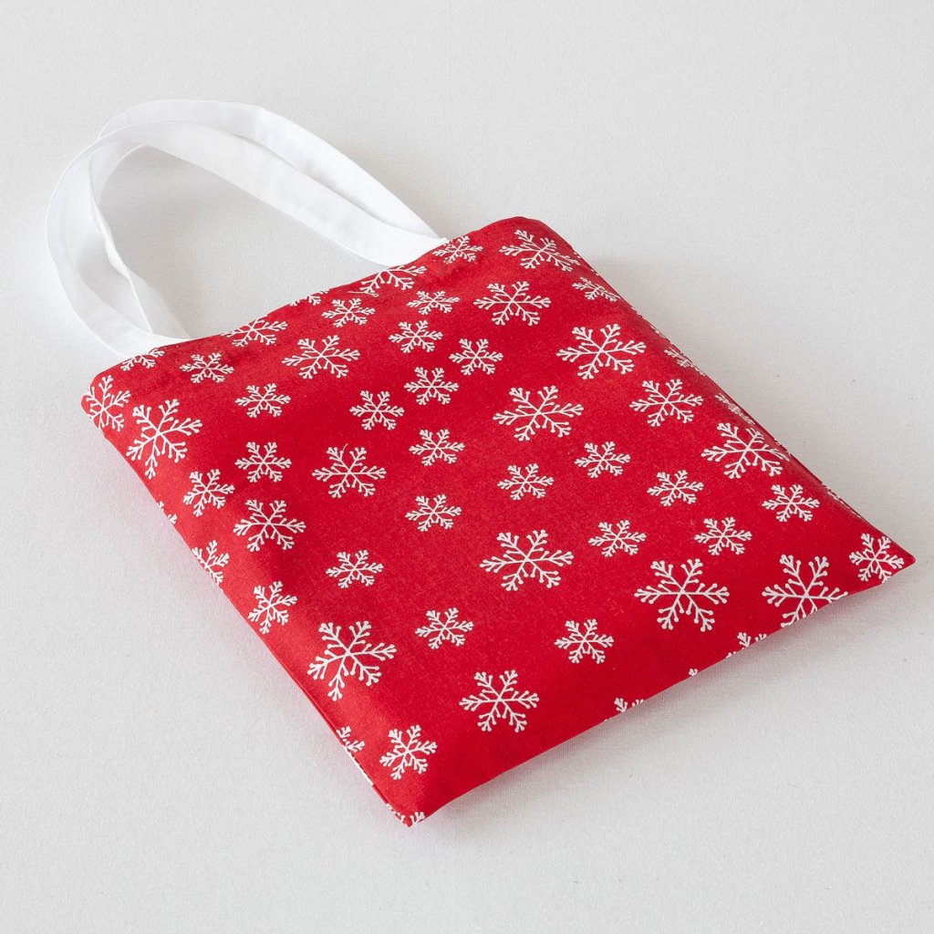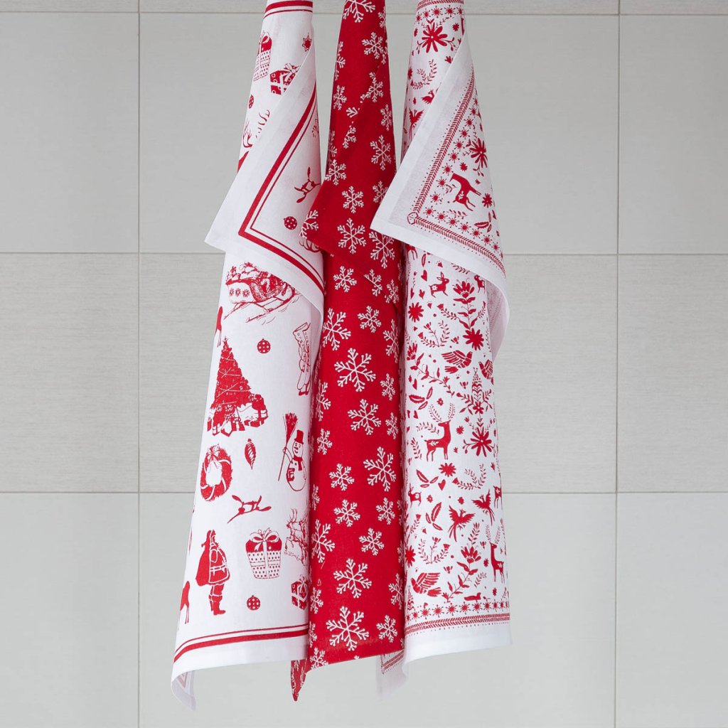 Červená plátěná taška v červené barvě s potiskem bílých sněhových vloček obsahuje 3ks utěrek. První je ve stejném designu jako taška, druhá je bílá s potiskem velkých obrázků se zimním a vánočním motivem a třetí je také bílá s červeným potiskem menších obrázků.