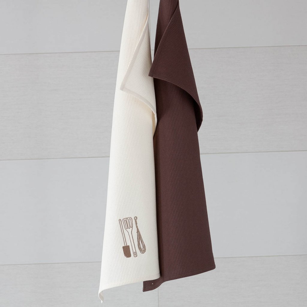 Vaflové utěrky - vysoce savé, rychle schnoucí. Dobře vypadají a jsou velmi praktické - je dobré je mít vždy po ruce! Utěrky dodáváme jako set 2ks, capuccino kostka + bílá utěrka s výšivkou vařeček. Obě utěrky jsou zakončeny obrubou, mají praktické poutko na zavěšení.