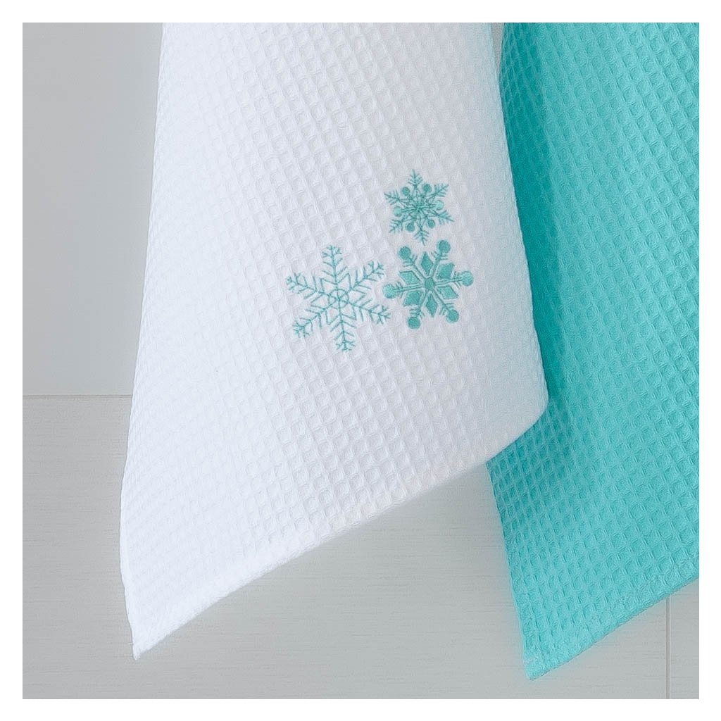 Vaflové utěrky - vysoce savé, rychle schnoucí. Dobře vypadají a jsou velmi praktické - je dobré je mít vždy po ruce! Utěrky dodáváme jako set 2ks, mintová utěrka + bílá s výšivkou sněhových vloček. Obě utěrky jsou zakončeny obrubou, mají praktické poutko na zavěšení.
