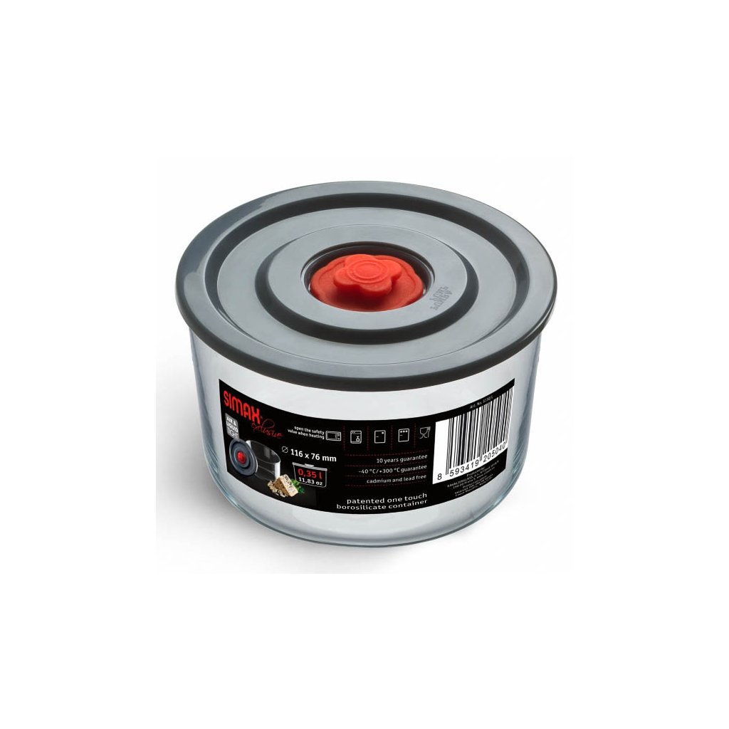 Dóza je vyrobena z kvalitního varného skla SIMAX, které je bez olova a kadmia a certifikované pro bezpečný styk s potravinami. Víčko s ventilem pro uvolnění páry zajišťuje voděodolné a vzduchotěsné uzavření, takže potraviny zůstávají čerstvé a bezpečně uložené. Při ohřevu v mikrovlnné troubě stačí ventil otevřít, aby mohla unikat pára.
